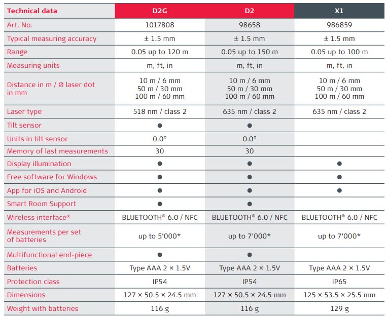 | Funkcijas | Nepārtrauktā mērīšana, Attāluma atlikšana, 2 Pitagora funkcijas, Perpendikula un diagonāles noteikšanas funkcija Kalkulators atņemšanai un saskaitīšanai, Platības noteikšanas funkcija, Kubatūras noteikšanas funkcija, Multifunkcionāls adapters, |